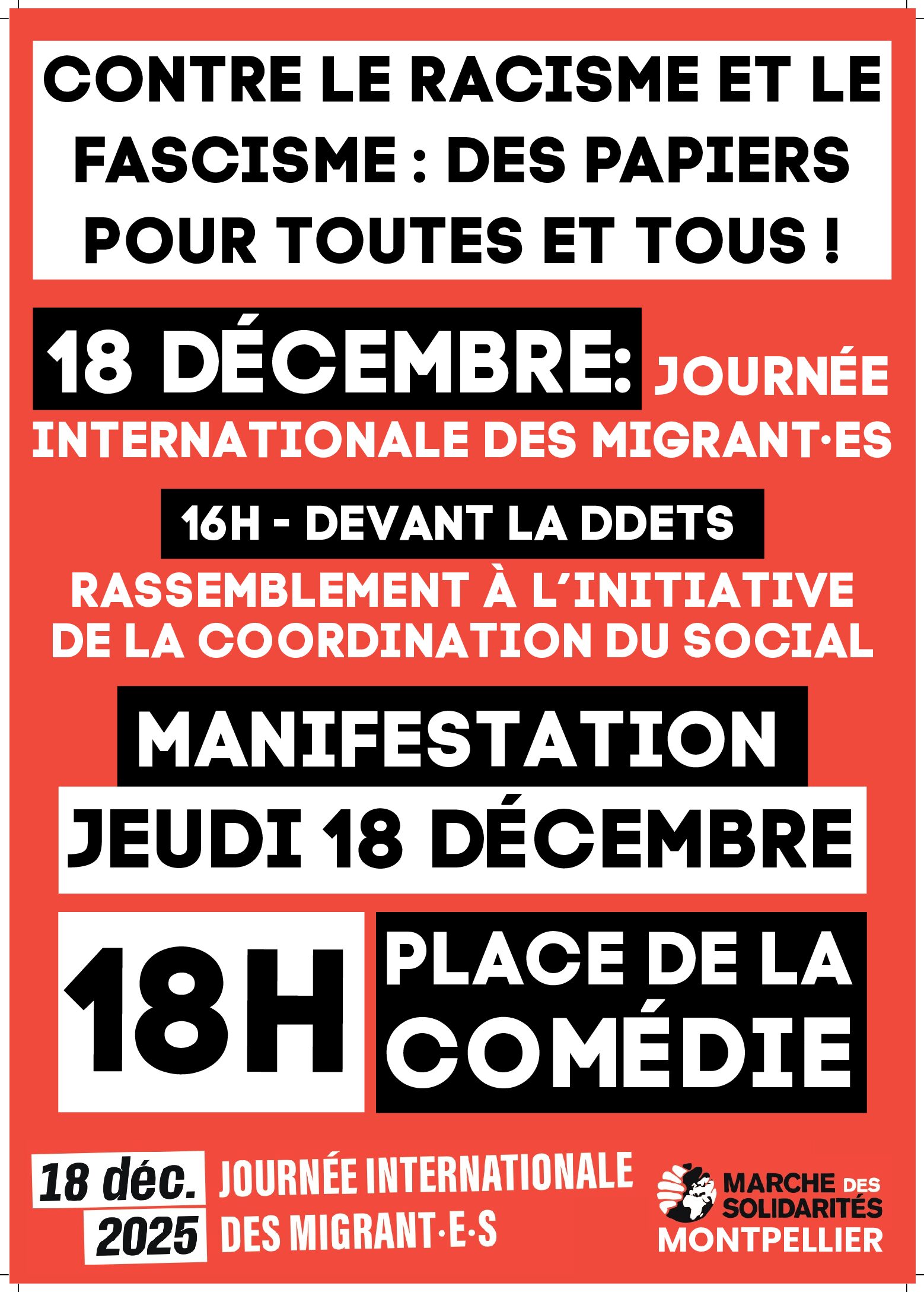 La Marche des Solidarités de Montpellier organise une manifestation rendez-vous à 18h place de la Comédie La cantine POP de l’AESAE nous prépare un repas pour notre arrivée sous l’arc de triomphe.