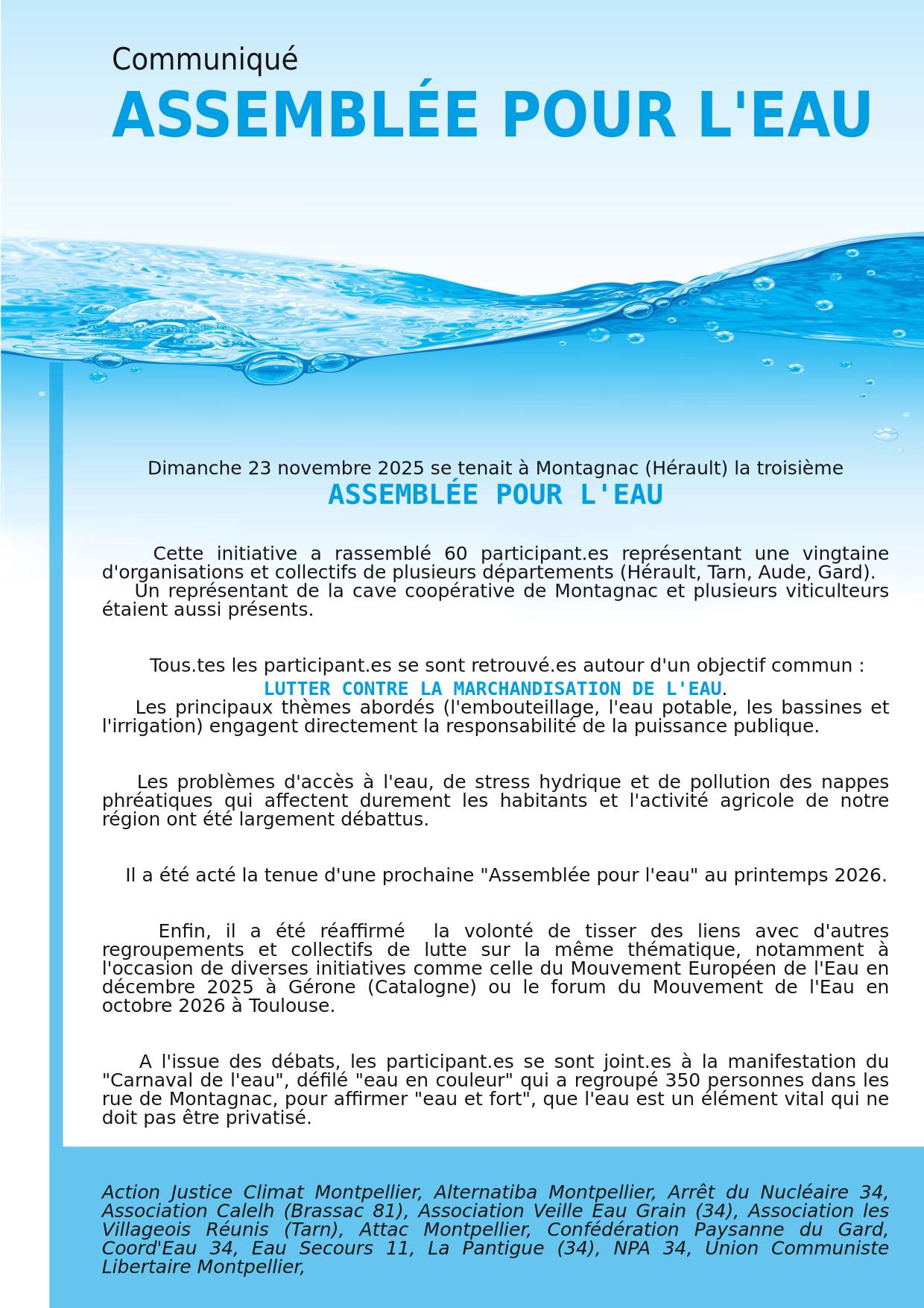 Dimanche 23 novembre 2025 se tenait à Montagnac (Hérault) la troisième « Assemblée pour l’Eau ».